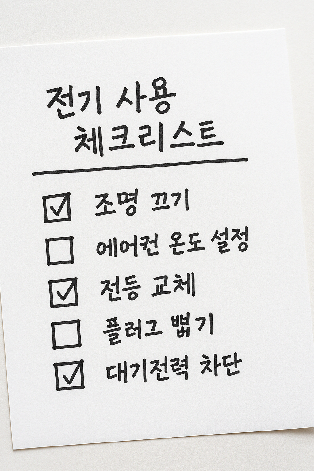 | 대기전력 차단 (멀티탭 사용) | ☐ | 예: 거실 TV, 셋톱박스 멀티탭 설치 |